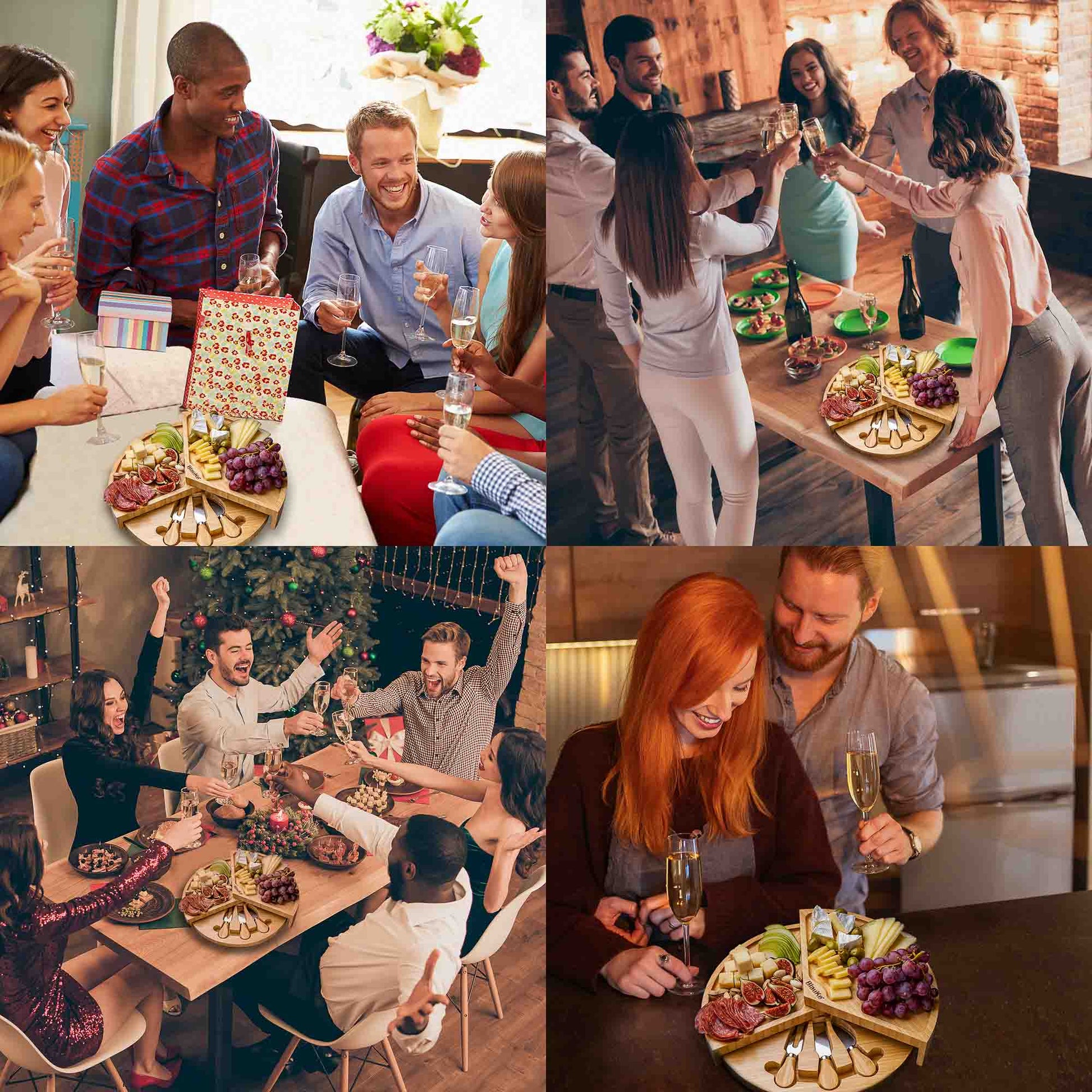También puede usar nuestra tabla de quesos como bandeja de madera para servir verduras, frutas, carne, galletas, aperitivos, tacos o sushi; como bandeja para fiestas; o como accesorio para acampar o hacer picnics. Esta tabla giratoria para cortar queso es un regalo ideal para cualquier ocasión: aniversario, Navidad, lista de bodas, inauguración de casa o despedida de soltera.